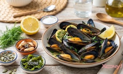 Мідії. Справжній суперфуд для ендокринної системи. Унікальне поєднання компонентів, які рідко зустрічаються в такій концентрації в інших продуктах. Висока концентрація органічного йоду, потужний вміст селену, цинк, легкозасвоюваний білок та амінокислота тирозин.